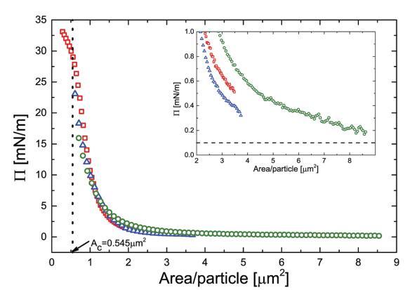 圖1 PNIPAM顆粒在空氣-水界面處的壓力面積等溫線。開放符號表示與三組不同實驗相對應的實驗數據點,即:(,)具有高初始顆粒負荷的NIMA槽,(B)具有低初始顆粒負荷的NIMA槽和(D)具有高初始顆粒負荷的Kibron m槽。插圖顯示了低負荷下壓力-面積曲線的展開視圖。插圖中的虛線表示壓力傳感器的檢測極限。