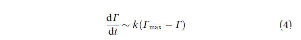 當系統接近飽和時,G(t)的下降速度必須隨著表面變得擁擠而減慢。吸附質濃度剛好低于表面,然后與吸附物種失去平衡,動力學受到吸附屏障的限制。一級動力學過程會導致: