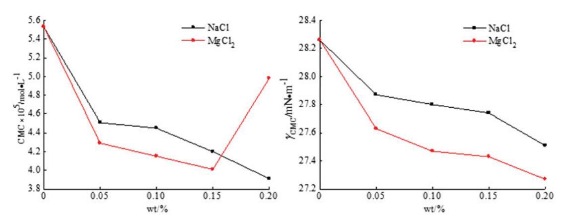 圖9。無機鹽(NaCl和MgCl2)對OCB/SDS體系中表面活性的影響。