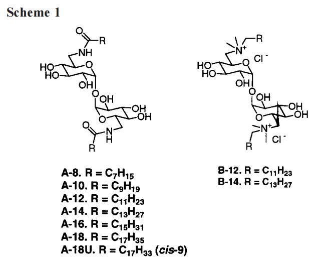 本文研究以海藻糖為間隔基的雙子座(方案1)。A系列由海藻糖組成,其6-和6′-羥基被長(zhǎng)鏈酰胺取代。B系列在6-和6′位置有長(zhǎng)鏈季銨鹽基團(tuán)。我們選擇海藻糖作為糖間隔物并不是隨意的。首先,海藻糖是一種雙糖,允許兩條烴鏈相隔相當(dāng)長(zhǎng)的距離。雙子座中受限的分子內(nèi)鏈/鏈相互作用是一種結(jié)構(gòu)特征,過(guò)去僅對(duì)其進(jìn)行了簡(jiǎn)要研究。15秒后,海藻糖(一種從細(xì)菌、藻類、昆蟲(chóng)和植物等多種自然來(lái)源中分離出來(lái)的糖)可以保護(hù)生物膜免受脫水的壓力。16因此,在生物膜的“細(xì)胞模擬”建模方面,我們對(duì)海藻糖雙子感興趣。17第三,從實(shí)用的角度來(lái)看,海藻糖很有吸引力,因?yàn)樗瑑蓚€(gè)完全相同的D-葡聚糖單元。這簡(jiǎn)化了化合物的合成和分析,與大多數(shù)其他雙糖相比,化學(xué)性質(zhì)不同的羥基數(shù)量減少了一半。但盡管對(duì)稱,合成純海藻糖雙子座的途徑(方案2和方案3)無(wú)疑是隨后物理化學(xué)的一個(gè)乏味的序言。