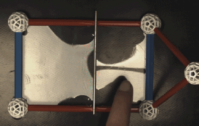 具有“橡皮膜”一般特性的肥皂水液膜。戳破一邊后,另一邊在表面張力的作用下迅速回縮。錄制者:Jubobroff