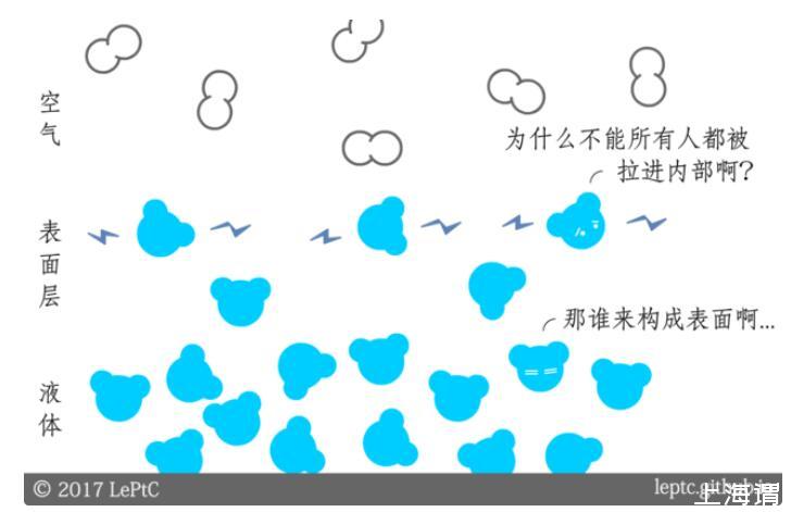 假設上下兩部分的壓強相同(壓強不同的情況將在第二節介紹),由于空氣對水分子的吸引力小于水分子之間的吸引力,所以位于表面的水分子會受到指向液體內部的力,一部分水分子被拉進液體內部,表面層的水分子開始變稀疏,直到吸引力減弱到和空氣接近時趨于平衡。表面層水分子的間距大于r0,因此吸引力占上風: