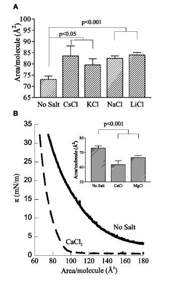 圖3:。各種反離子的影響。(A)用250 mM鹽緩沖HEPES亞相上的L-R PIP2在π)30 mN/m處的每分子面積;平均值(SE,n)5。(B)π-L-R PIP2 HEPES緩沖亞相的面積等溫線,pH 7.4,30°C(實線),相同條件加250 mM CaCl2(虛線);(插圖)250 mM CaCl2和MgCl2影響的量化;平均值(SE,n)4。