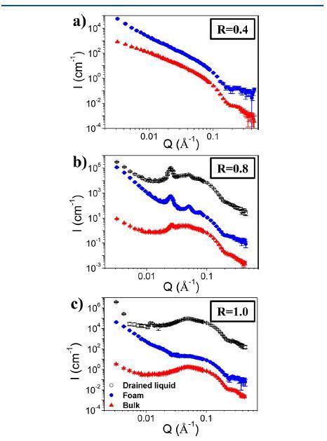 圖2:對于(a)R=0.4,(b)R=1.0和(c)R=2.0,散裝溶液(紅色三角形)、泡沫(藍(lán)色圓圈)和排出液體(黑色空圓圈)的SANS光譜。為清晰起見,將光譜強度相互偏移了100倍。