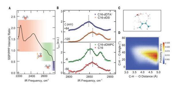 十六烷液滴在D2O中的SFS光譜中~100 cm?1的相當大的頻率偏移(由灰色峰形突出)表明,電荷必須從水的O–D基團轉移到油相的十六烷C-H基團上,因為它們是接受電子密度的唯一候選基團。如果存在如此強的相互作用,即可以預期油分子的振動模將經歷向與高頻O-D模相反的方向移動。這種遷移應伴隨著結構的變化,如C–H???O H鍵的存在。為了研究這一點,記錄了界面C-H模的SFS譜,并進行了MD模擬。界面C-H模的SFS譜圖顯示了CH 2(CH 2-ss)和CH 3(CH 3-ss)的對稱拉伸模在~2850和~2878 cm?1附近。十二烷-水界面顯示水和油分子相互作用讓人聯想到水和油之間的H鍵。作為C-H鍵的弱H鍵的受體,水分子上的O孤對提供了一些電子密度,使十二烷分子帶一個負電荷。