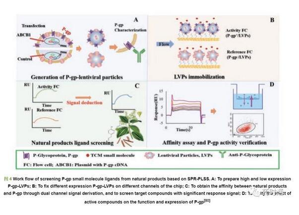 針對慢病毒載體穩定技術結合SPR在中藥活性成分篩選中的應用,本課題組已展開一些探索性研究。P-糖蛋白(P-gp)是體內最重要的外排型轉運蛋白,具有12次跨膜的復雜結構,且尚未商品化。Cao等[80]采用LVPs穩定策略,獲得活性良好的P-糖蛋白,構建了一種基于SPR的P-糖蛋白配體篩選系統。首先,獲得P-gp高表達和低表達的LVPs,然后將P-gp高/低表達的LVPs分別固定在CM5芯片上作為活性通道和參比通道。以P-gp抑制劑伐司樸達(valspodar,Val)和環孢素(cyclosporin,CsA)為陽性對照,從天然產物庫中快速篩選出厚樸酚、和厚樸酚和白藜蘆醇作為潛在的P-gp配體(圖4)[80]。Chen等[81]構建了CXCR4的配體篩選體系,將高/低表達的CXCR4的慢病毒顆粒固定在CM5芯片上,以趨化因子受體拮抗劑AMD3100為陽性化合物,從川芎提取物中篩選出洋川芎內酯Ⅰ為CXCR4的潛在配體。