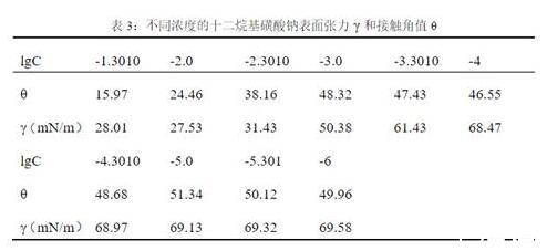取不同濃度的十二烷基磺酸鈉溶液各25mL,與其濃度相同的枯草菌脂肽鈉溶液25mL混合,使其濃度比約為1。對混合溶液攪拌,靜止30min,用表面張力儀測試其表面張力和接觸角。其原始數(shù)據(jù)如下表: