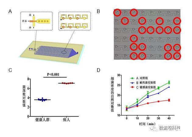圖3A.液滴微流控芯片原理設(shè)計(jì)圖結(jié)構(gòu)包含上游的液滴生成區(qū)和下游的液滴捕獲區(qū);B.利用液滴熒光成像分辨細(xì)菌陽(yáng)性和陰性液滴;C.液滴數(shù)字化分析顯示健康人和尿路感染病人尿液細(xì)菌計(jì)數(shù)差別;D.液滴數(shù)字化分析顯示敏感和耐藥細(xì)菌對(duì)于抗生素的反應(yīng)。