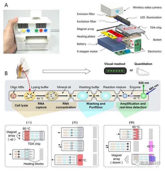 分子診斷是新興的檢驗(yàn)醫(yī)學(xué)領(lǐng)域。隨著熒光定量PCR的推廣,基因檢測(cè)技術(shù)在臨床醫(yī)學(xué)中得到了廣泛應(yīng)用。盡管如此,現(xiàn)有核酸分析平臺(tái)的一些不足之處還是限制了分子診斷技術(shù)的推廣:1)場(chǎng)地要求嚴(yán)格,試劑準(zhǔn)備、核酸提取和擴(kuò)增需要分別在獨(dú)立房間內(nèi)進(jìn)行,極大限制了該技術(shù)在醫(yī)療資源有限條件下的開(kāi)展;2)采用離線(xiàn)式分析,操作復(fù)雜、分析周期較長(zhǎng),不利于應(yīng)對(duì)突發(fā)性事件;3)現(xiàn)有的熒光定量PCR方法多是針對(duì)單一指標(biāo)檢測(cè)設(shè)計(jì),對(duì)于多重基因檢測(cè)無(wú)論是操作繁瑣程度還是測(cè)試成本均是難以接受的。