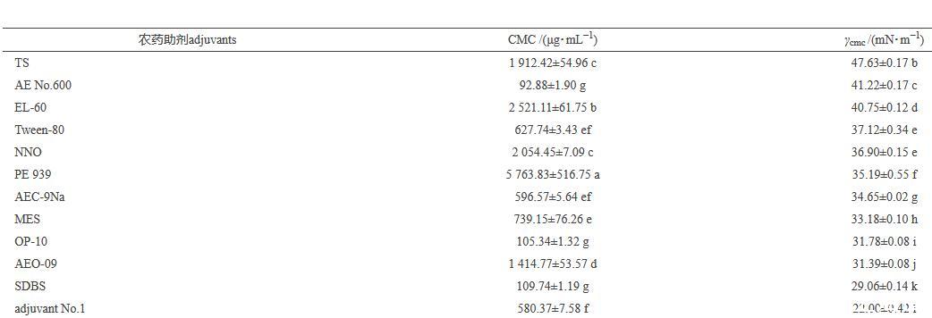從表2中可見:不同種類的助劑具有不同的臨界膠束濃度(CMC)和臨界膠束濃度時表面張力(γcmc),與其對照(水)相比各助劑臨界膠束濃度時的表面張力均小于水的臨界表面張力[(72.75±0.01)mN/m],并存在顯著性差異。其中,助劑1#、2#和4#當質量濃度達到CMC時表面張力的降低率在72.63%~69.75%,助劑4#的效果最好,其次是助劑1#和2#,臨界表面張力分別是(19.91±0.11)、(20.00±0.01)和(22.00±0.42)mN/m。而自制的助劑3#以及目前農藥生產上應用較為廣泛的常規綠色助劑十二烷基苯磺酸鈉(SDBS)、烷基酚聚氧乙烯醚(OP-10)、Tween-80和農乳600#等與助劑1#、2#和4#相比,對水表面張力的降低能力稍弱,但在P<0.05水平上差異顯著性分析表明均顯著低于水的臨界表面張力。茶皂素對水的表面張力影響最小,臨界表面張力為(47.63±0.17)mN/m,降低率僅為34.53%。