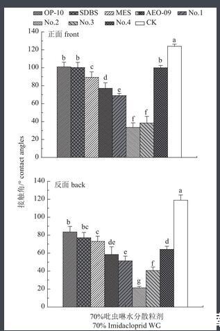 圖3助劑對藥液在小麥葉正、反面靜態接觸角的影響