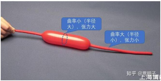 氣球內部的氣體壓力處處相等,但是,接觸過這種氣球的人都有一個經驗,就是粗的地方繃得緊,而細的地方繃得就不那么緊。如上圖所示,繃得緊的地方和繃得松的地方,產生的壓力差是相等的,但是他們的曲率是不相等的:曲率越大,同樣的張力所能產生的壓力差就更大。