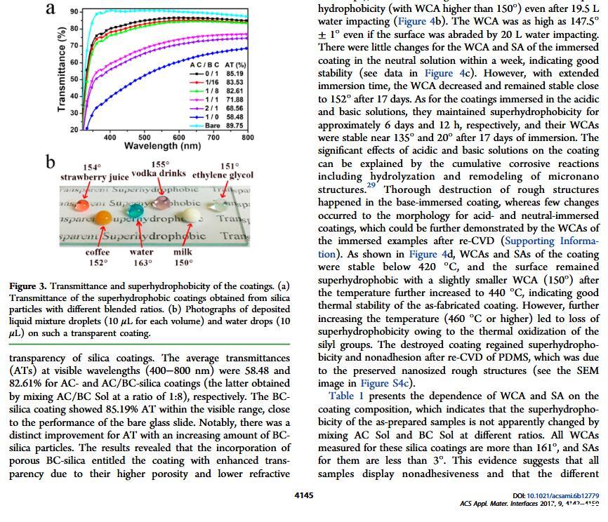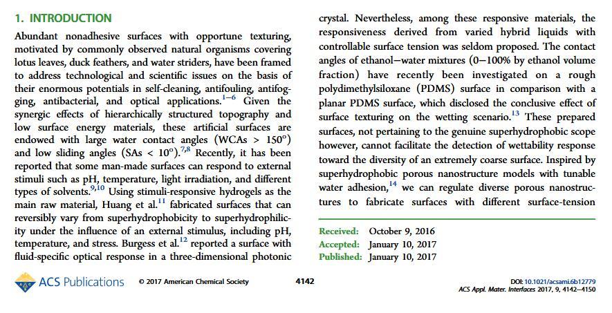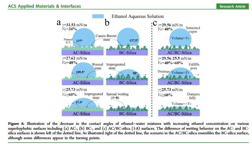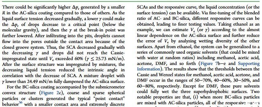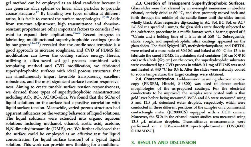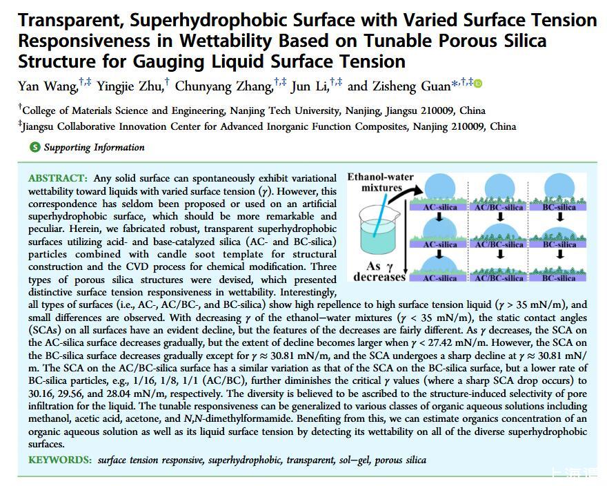 當液體的表面張力發生變化時,它在普通固體表面的潤濕性也會隨著變化。然而,關于這一規律以及尤其是在超疏水表面的表現的研究很少。最近,協同創新中心PI-6管自生老師課題組研究生王研等人利用上述的表面張力和潤濕性的響應關系首次將透明超疏水涂層應用在探測液體表面張力方面,為拓寬多功能超疏水涂層的應用提供了一個新的思路,相關論文已被ACS applied materials&interfaces發表。研究表明,隨著有機物水溶液中有機物體積分數上升,溶液的表面張力相應地下降,溶液液滴在制備的超疏水涂層的接觸角也逐漸下降,此稱之為表面潤濕性對表面張力的響應。基于此響應關系,可以通過接觸角估測液體的表面張力以及有機物的濃度。