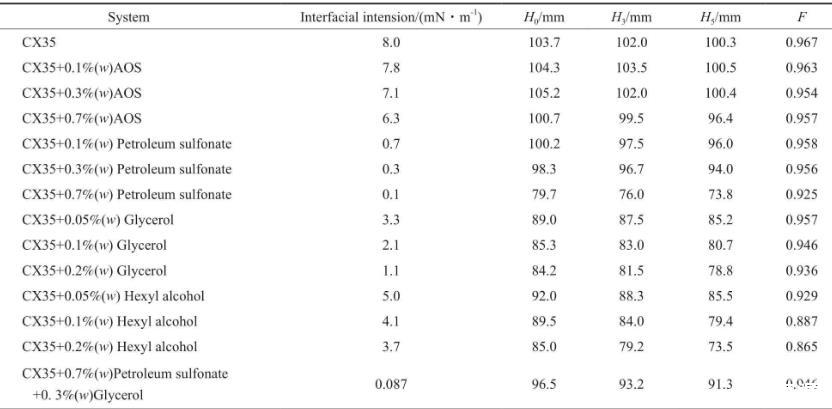 CX35雖具有降低油水界面張力的能力,但加入CX35后,油水界面張力仍大于10-1mN/m數(shù)量級(jí)。離子型表面活性劑與醇混合可降低油水界面張力,但醇會(huì)影響驅(qū)油劑的起泡性能。不同復(fù)配體系的油水界面張力見表1。由表1可看出,石油磺酸鹽降低界面張力的效果尤為突出。這是因?yàn)椋突撬猁}含苯環(huán)及類苯結(jié)構(gòu),且苯環(huán)上有疏水碳鏈,與原油中的瀝青質(zhì)和芳烴等物質(zhì)結(jié)構(gòu)相似,故石油磺酸鹽易吸附在油水界面上從而降低油水界面張力。同時(shí),石油磺酸鹽還可提高驅(qū)油劑在空隙中的洗油效率,也可通過乳液產(chǎn)生的阻力提高驅(qū)油劑的波及效率。在m(CX35)∶m(石油磺酸鹽)∶m(甘油)=1∶0.7∶0.3的條件下得到的ZX35的起泡高度可達(dá)到95 mm以上,穩(wěn)泡能力達(dá)到0.946。