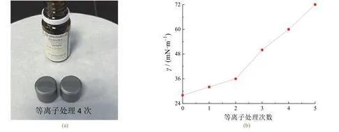 圖1典型的表面張力測試照片(a)及等離子處理次數與涂層表面張力的關系(b)